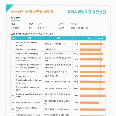 Daily TEST의 결과는 수업 종료 5분 후에 학부모님의 카톡으로 성적표 전송